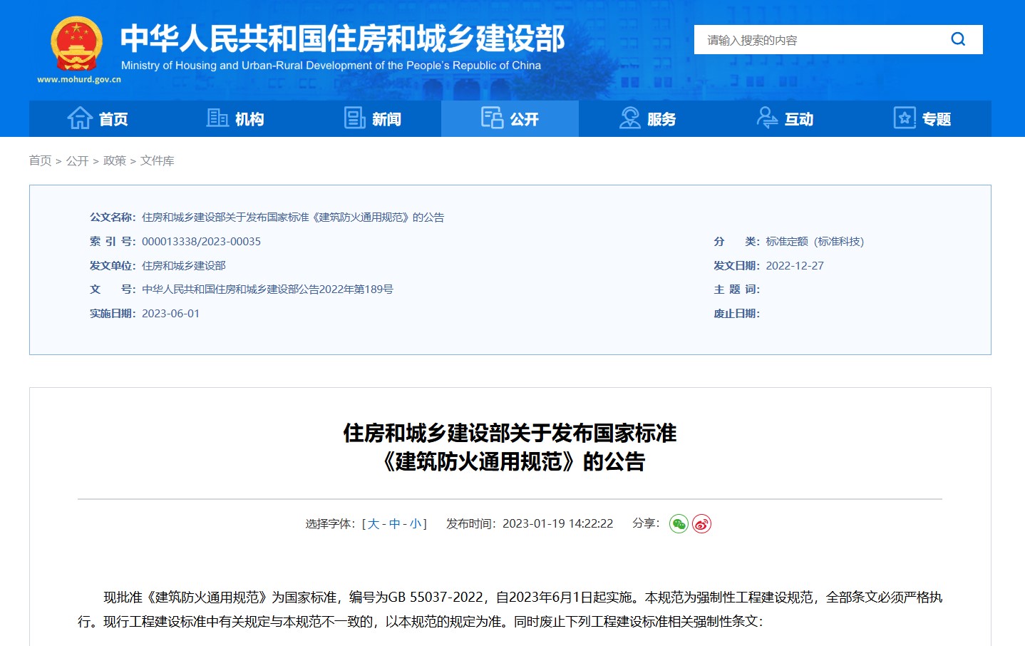 2023年1月19日,中華人民共和國住房和城鄉(xiāng)建設(shè)部公告2022年底189號文件發(fā)布,批準(zhǔn)《建筑防火通用規(guī)范》為國家標(biāo)準(zhǔn),編號為GB 55037-2022,自2023年6月1日起實施。本規(guī)范為強(qiáng)制性工程建設(shè)規(guī)范,全部條文必須嚴(yán)格執(zhí)行。